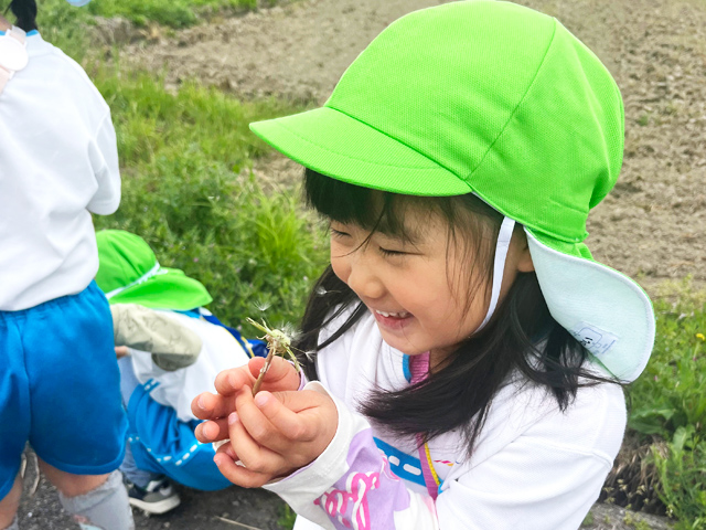 園庭に出たり、お散歩に行ったり、自然の中で思いきり遊ぶ時間をできる限り作るようにしています。 子ども達が自ら"自分の好きな遊び"を見つけ、生き生きと遊びこむことで子ども同士の遊びも広がり、考える力や思いやりの心も育っています。